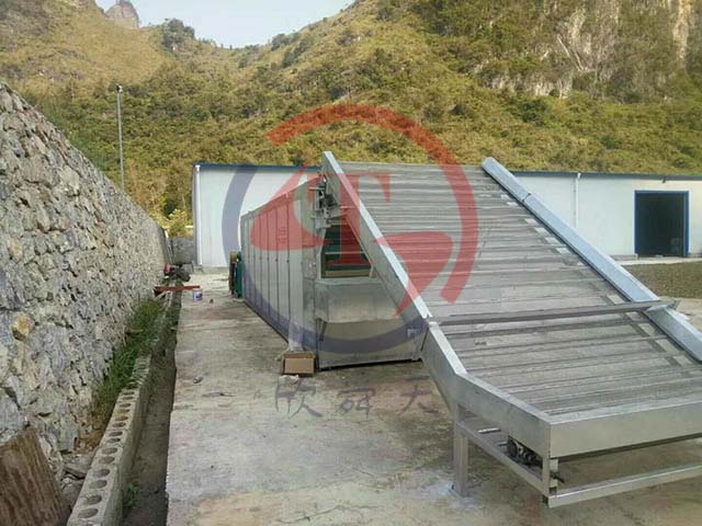 該烘干機,單層或多層結構,以多層為主,減速機鏈條傳動,多層網帶式烘干機,由上料機,將物料斜向上送到網帶頂層,多層網帶同時轉動,物料從上料機到頂層、第二層、第三層、第四層、第五層、第六層、最多第七層,然后輸出干品;現在一般選擇雙層,四層或六層,出料是從進料端的底部輸出,另一端安裝風機,風機與熱風發生器相連,熱風從烘干機底部風道吹進,然后由導風板,分段向上導,這樣進風比較均勻,如果是側進風,很難保證風的均勻,熱風經過多層物料,由頂層排濕口直接排出。網帶式烘干機由變頻控制,上料機和主機可以同速,分別傳動,也可以不同速;上料機的進料處,裝有勻料機,保證料層均勻。