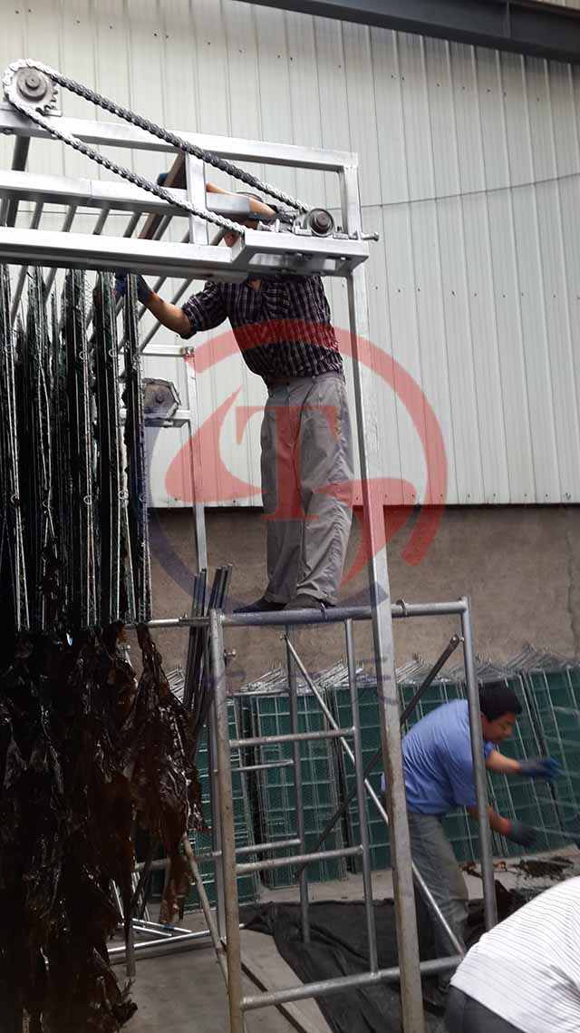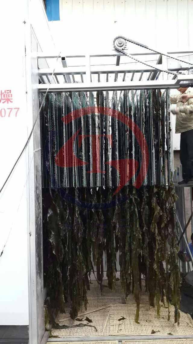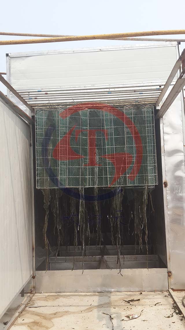 鮮海帶長度約1.5m~3m,寬度約20cm~45cm,表面特別粘滑,兩片海帶粘連在一起,幾乎沒法烘干和曬干,所以天然海帶烘干采取何種通風方式,海帶        是選擇平鋪還是懸掛?就顯得關鍵。